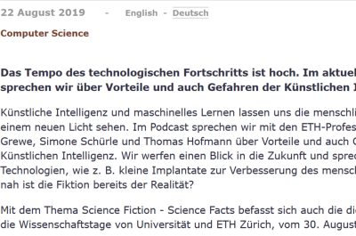 Das Tempo des technologischen Fortschritts ist hoch. Im aktuellen ETH-Podcast sprechen wir über Vorteile und auch Gefahren der Künstlichen Intelligenz. Künstliche Intelligenz und maschinelles Lernen lassen uns die menschliche Intelligenz in einem neuen Licht sehen. Im Podcast sprechen wir mit den ETH-Professoren Benjamin Grewe, Simone Schürle und Thomas Hofmann über Vorteile und auch Gefahren der Künstlichen Intelligenz. Wir werfen einen Blick in die Zukunft und sprechen über neue Technologien, wie z. B. kleine Implantate zur Verbesserung des menschlichen Gehirns. Wie nah ist die Fiktion bereits der Realität? Mit dem Thema Science Fiction - Science Facts befasst sich auch die diesjährige Scientifica , die Wissenschaftstage von Universität und ETH Zürich, vom 30. August bis 1. September.